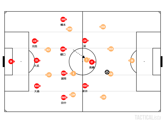 >①福島からすればビルドアップは3vs2となり数的有利。