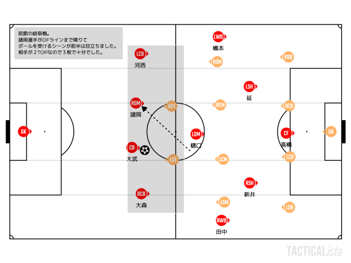 諸岡選手がDFラインまで降りてボールを受けるシーンが前半目立ちました。
