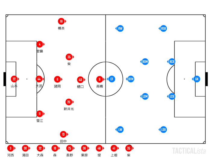 中盤は諸岡選手をピボーテに置き、新井選手とサプライズ起用の柴選手をインサイドハーフに置く3枚。