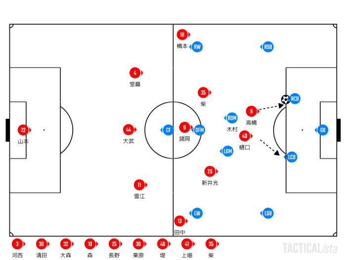 そしてプレスの際は並列な2トップでしたが、攻撃時は縦関係になり4-4-2の弱点ともいうべきバイタルに樋口選手が構えるという意図も見えました。
