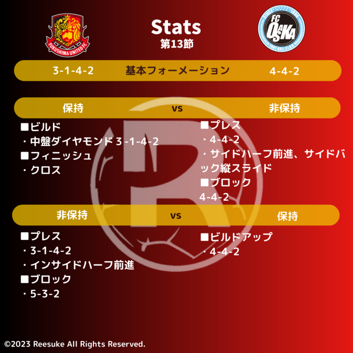 福島U対FC大阪の試合は、両チームの陣形とプレースタイルが注目される一戦だった。スタッツは以下の通り。