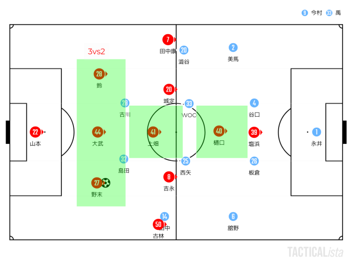 福島Uは巧妙な配置を活かして、大阪の4-4-2陣形の間に選手を配置。上畑選手は大阪の2トップと中盤の間にポジショニングし、樋口選手は大阪の中盤とセンターバックのライン間でボールを受ける役割を果たした。