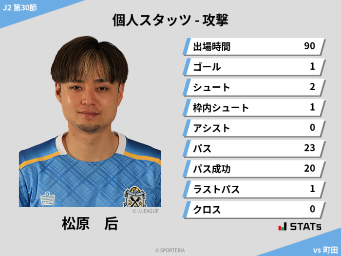 後半49分:三浦からのフィードを松原がヘディングでゴール前へ繋ぐと、後藤が競り合いを制す。ゴール前に走り込んできた松原が、後藤が落としたボールをハーフボレーでGKの上を抜き、一矢報いる。