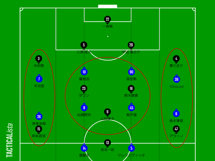 町田は自陣のバイタル、まず中を固める事を第一としているため、どうしても外が空く。
