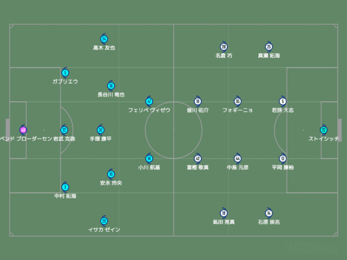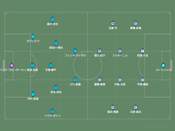 - 両WBで開幕から出場していた右のイサカゼインと、左の高木も6〜7節で入れ替わっていて、イサカは負傷だったのでしょうか?両者ともこの試合から戻ってきました。
