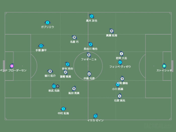 - フォギーニョのミッションはこの長谷川のケアで、そのために前線のプレスに参加せず、長谷川が動くのを監視しながら中央で待っている。長谷川が高木のサイドでサポートすると起動し、CBの若狭と平岡を中央の防備に専念させるタスクを担っていたと思います。横浜の前線は、長谷川以外のタスクはシンプルで、長谷川がいわゆる”変化をつける”役割なので、フォギーニョがこのエリアをどれだけ封鎖できるかはゲームのポイントになっていました。