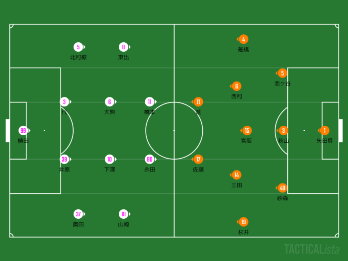 Jリーグ公式では三田がトップの位置に入っていますが、実際は佐藤がトップで三田はシャドーのポジションだと思います。