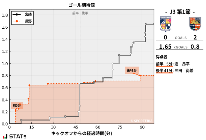 ロングボールだけでなく、地上戦でパスをつなぎながら、長野のアンカー脇のスペースを使って攻め込むシーンも出てくるようになりました。ゴール期待値からもわかるように、後半はかなり攻め込んでいた宮崎ですが、押し込んでいた割にはあまり決定機を作れなかったという印象です。逆に押し込みながら後半はほとんどチャンスらしいチャンスのなかった長野にカウンターを食らって追加点を許しました。