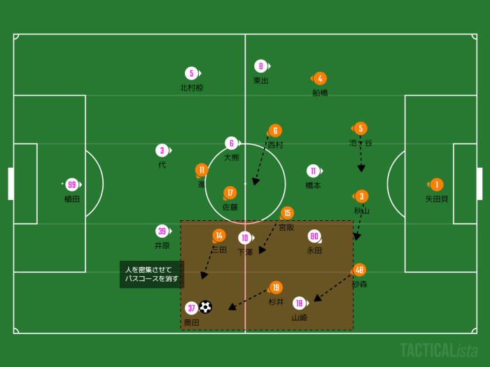 長野は守備時の陣形はリトリート時とプレッシング時で使い分けています。リトリート時は5-1-3-1のような陣形を取ります。プレスに行く場合はWBが前に出て、CBがサイドハーフを見るような形になります。サイドにボールが出ると、全体が圧縮し、追い込んで奪うのが狙いです。