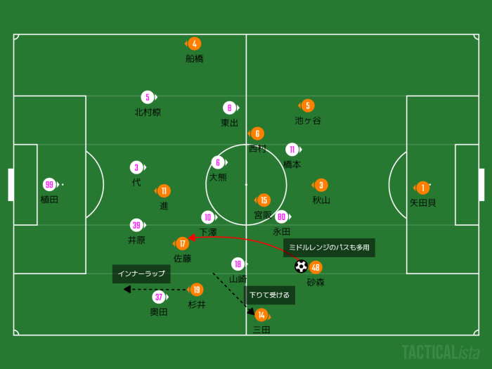 また、長野が圧縮してプレスに来るのを逆手に取って、CB経由で逆サイドに展開できていた時は深さを取ることができていました。特に右から左への展開でゴール付近まで進入することはできていたように思えます。