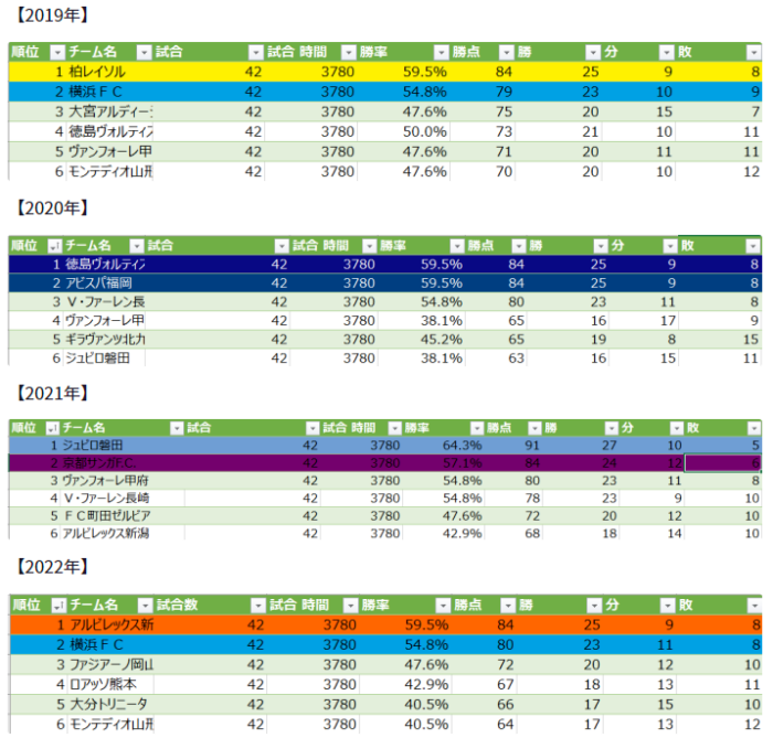 過去4年間のJ2リーグ6位までの勝敗データです。