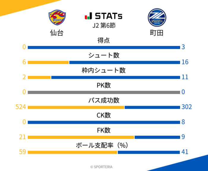 前回のユアテックスタジアムでの対戦は町田の3-0の勝利。スタッツをみても町田に支配された内容だった。特に、町田の高江と佐野のダブルボランチは安定感があり、効率的に得点を重ねた。一方、仙台は効果的な攻撃は見せられず、自陣でのボール保持に終始した。