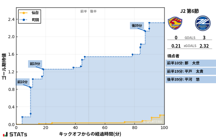 仙台も町田もクロスからの得失点が多い。守備のクロス対応に課題があるものの、どちらもチームも良いサイドアタッカーが揃っているので、クロスからのチャンスも多い。