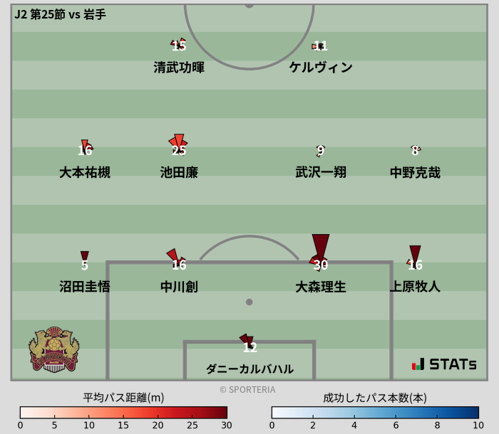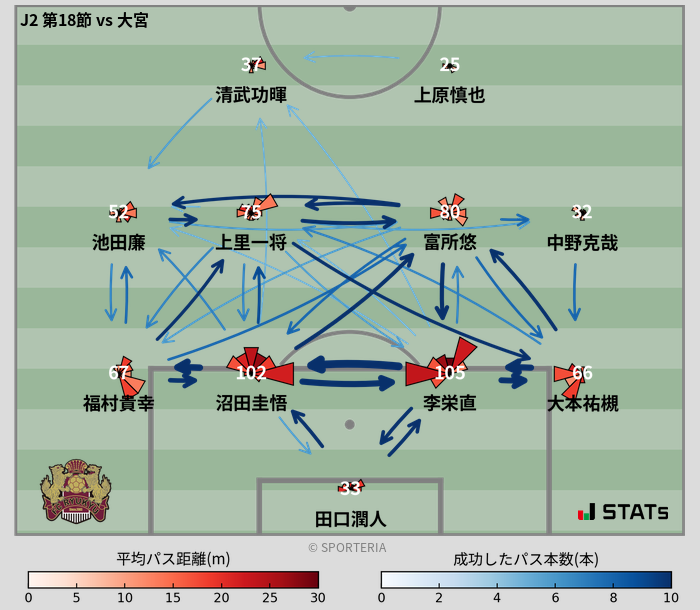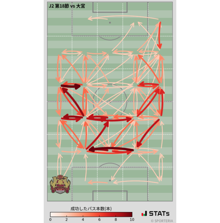 喜名監督はDFラインから丁寧にボールを保持し、ボランチを経由しつつサイド、FWにボールを運んでいくスタイルを目指していた。そのため、これまでの試合では、平均成功パス数は約400程度、多い時は604本(第18節大宮戦)を記録している。