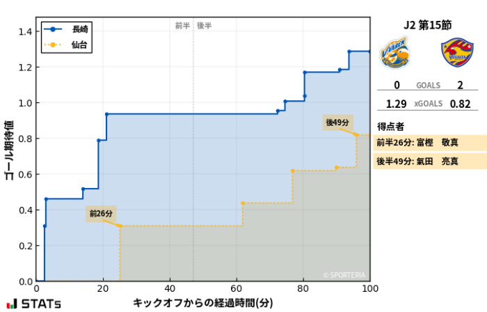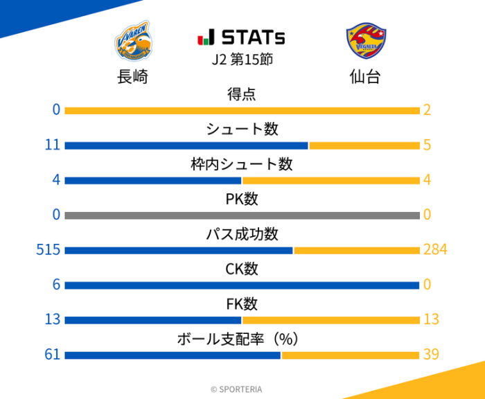 前回対決は終始長崎にゲームを支配された感のある試合だった。一方で、忍耐強く長崎の攻撃を防いだ仙台が、随所で鋭いロングカウンターを繰り出し、冨樫と氣田の得点で2-0の勝利を挙げた。