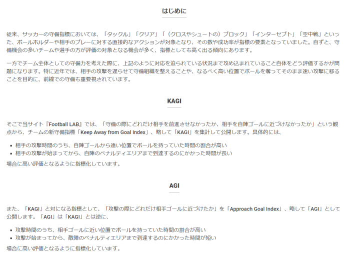 KAGI数値が高いチームは即時奪回を狙っている・相手に速攻をさせない守備が出来ている・帰陣が速い・DFラインを高めに設定して守っているようなチームとなります。