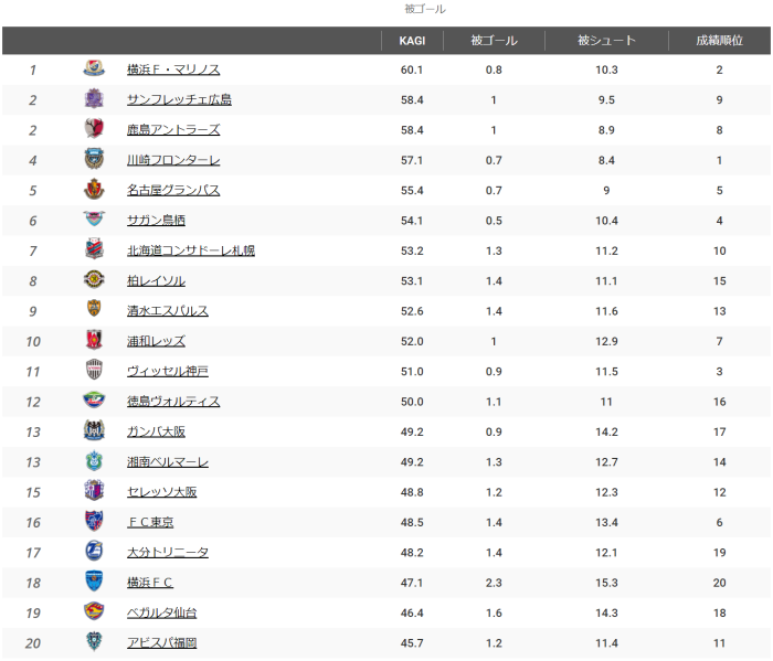 >福岡やセレッソはKAGIは低いものの、被ゴールは少ない。