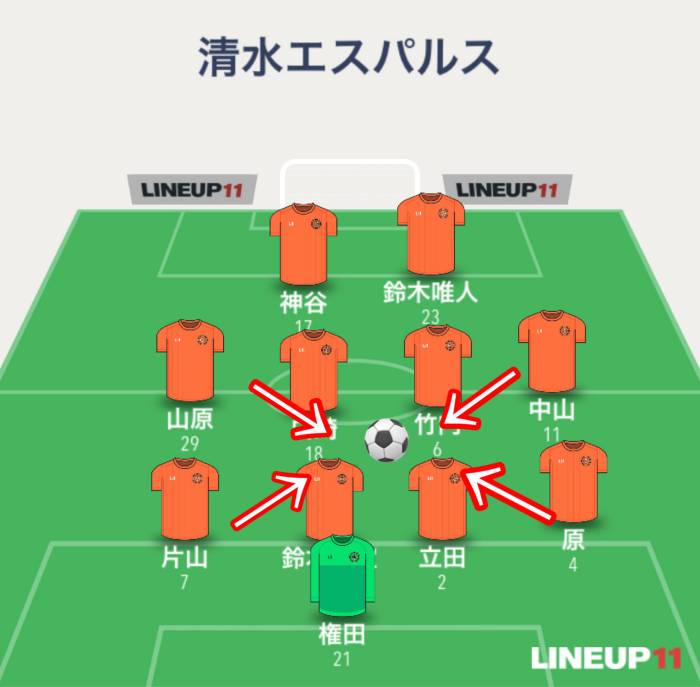 ここで清水の守備ブロックは中央に圧縮してきます。