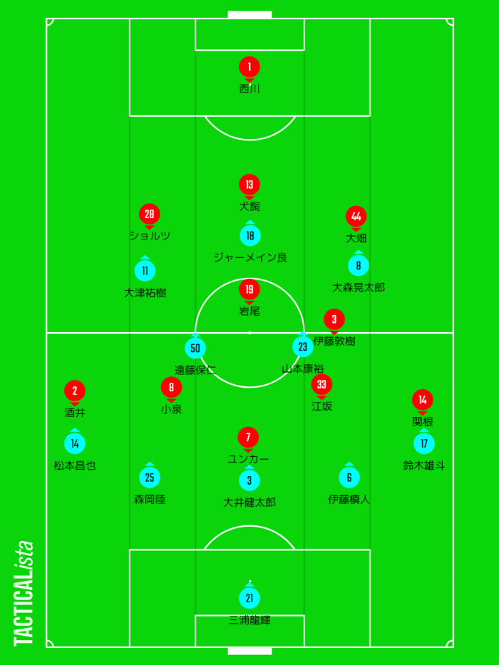 浦和は攻撃時3-2-5に可変するのですが、岩尾・伊藤敦樹・小泉・江坂のポジショニングが秀逸でした。
