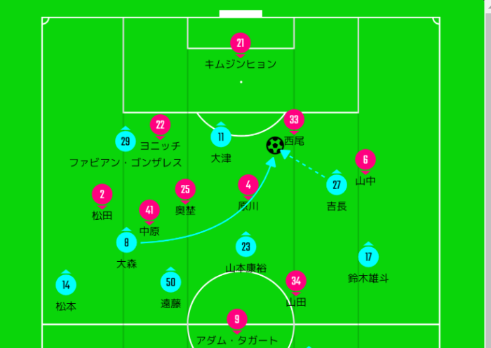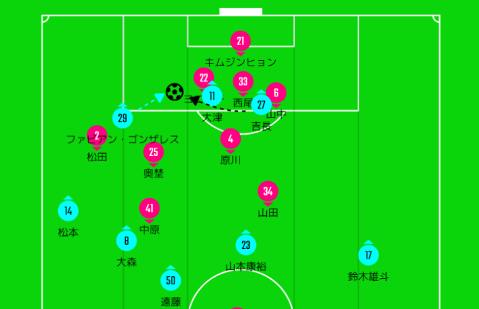 ・後半9分30秒~ 鈴木選手からSBの裏にスルーパス→大津選手のクロス