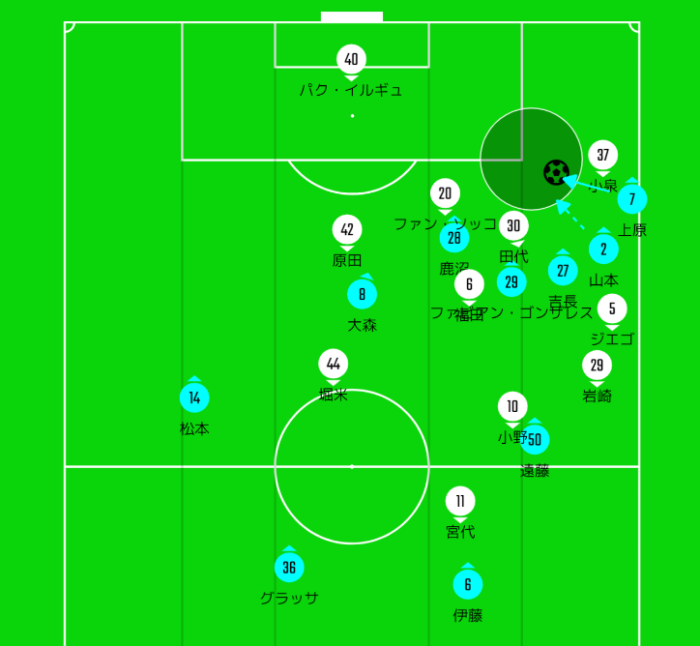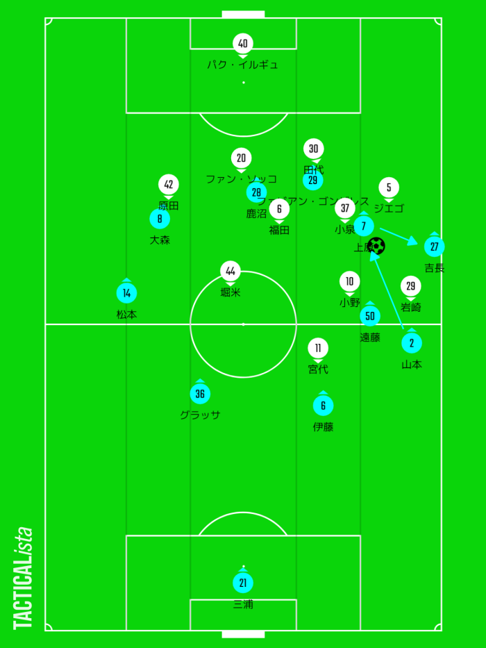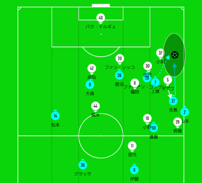 リスタートのボールを受けた山本義道からパスを受けた上原はジエゴと岩崎の中間ポジションでフリーな吉長へダイレクトパス。