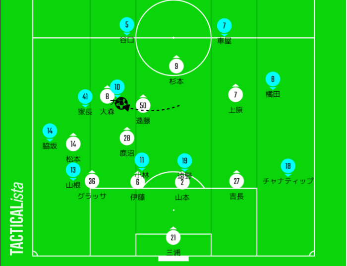 この試合では鳥栖戦の後半押し込まれた反省を活かしてか、伊藤槙人を中心としたDFラインが高い位置を取ろうとしていたことが良かったと思います。