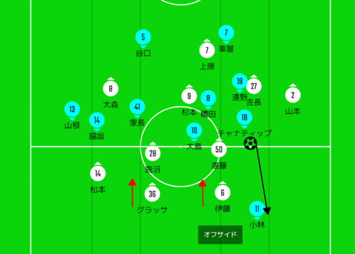 小林にスルーパスを送るが、伊藤槙人中心に素早くDFラインを上げたため、小林はオフサイドに。