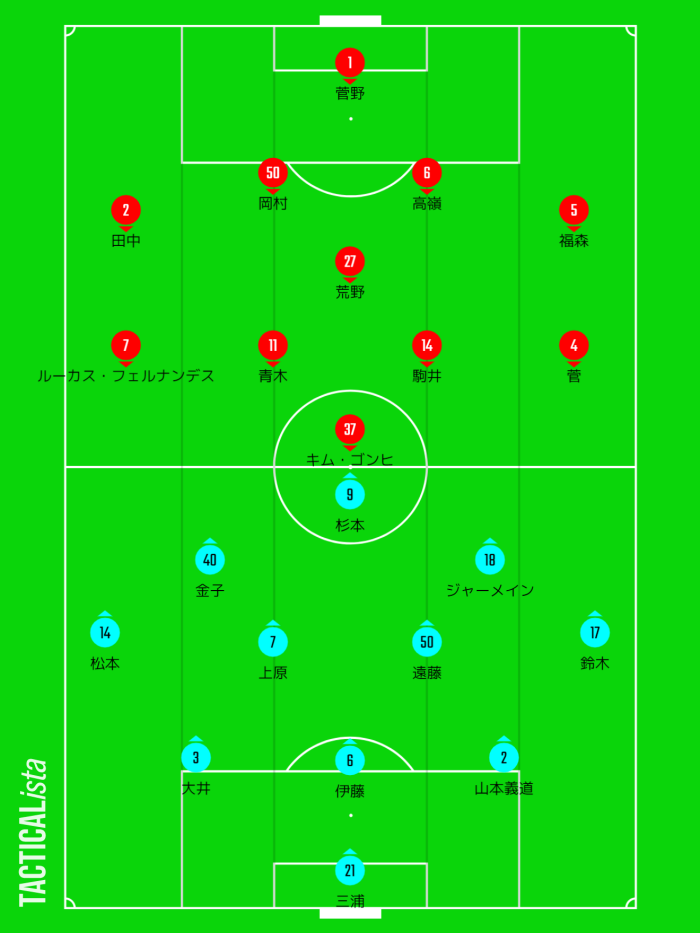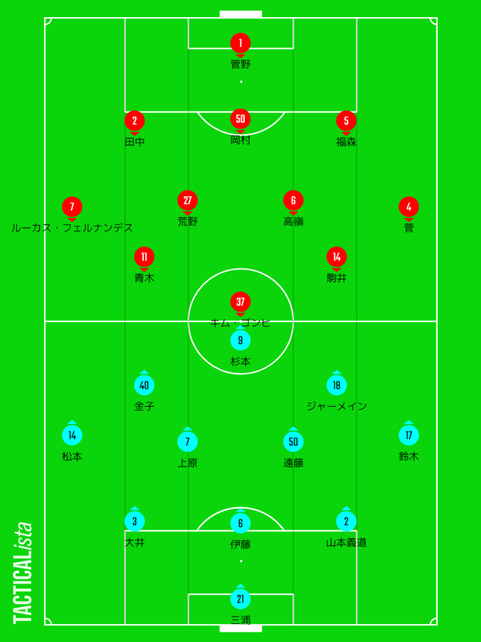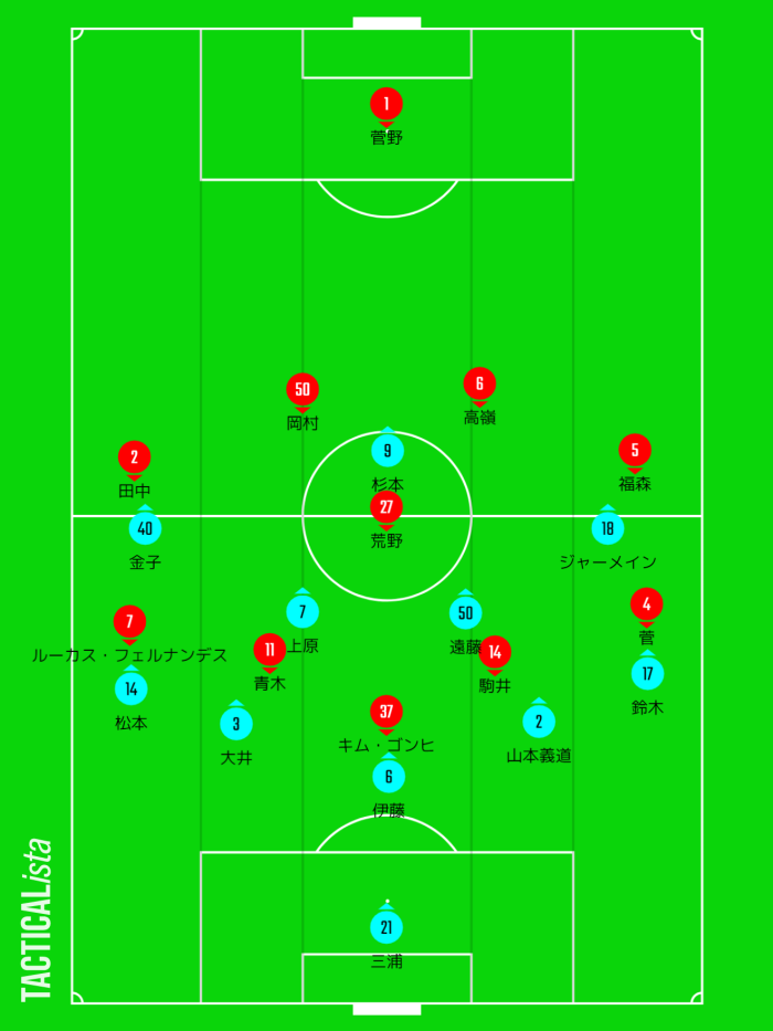 守備面ではシャドー(この図では青木・駒井)を大井・山本が見るのか、上原・遠藤が見るのか、マークの受け渡しが重要です。