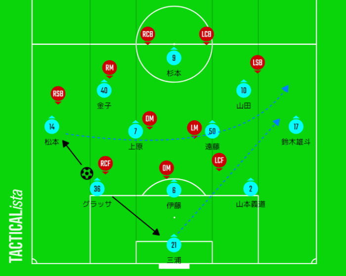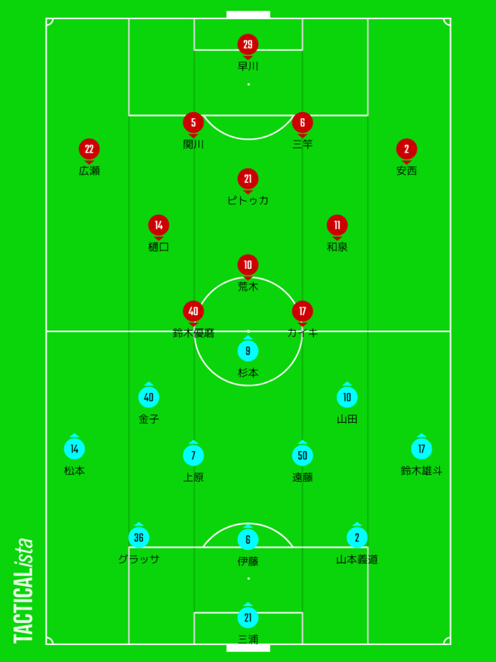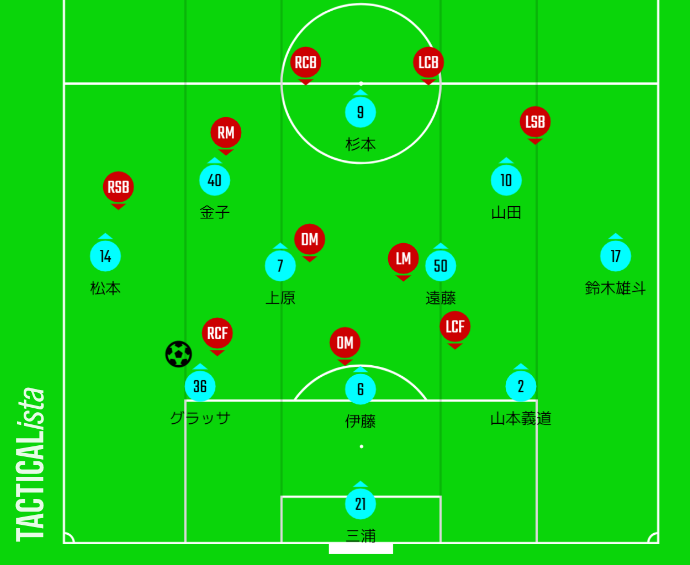 鹿島の失点はセットプレーからが1番多いため、ヤットさんのキック精度を活かしたセットプレーから得点を狙いたい。