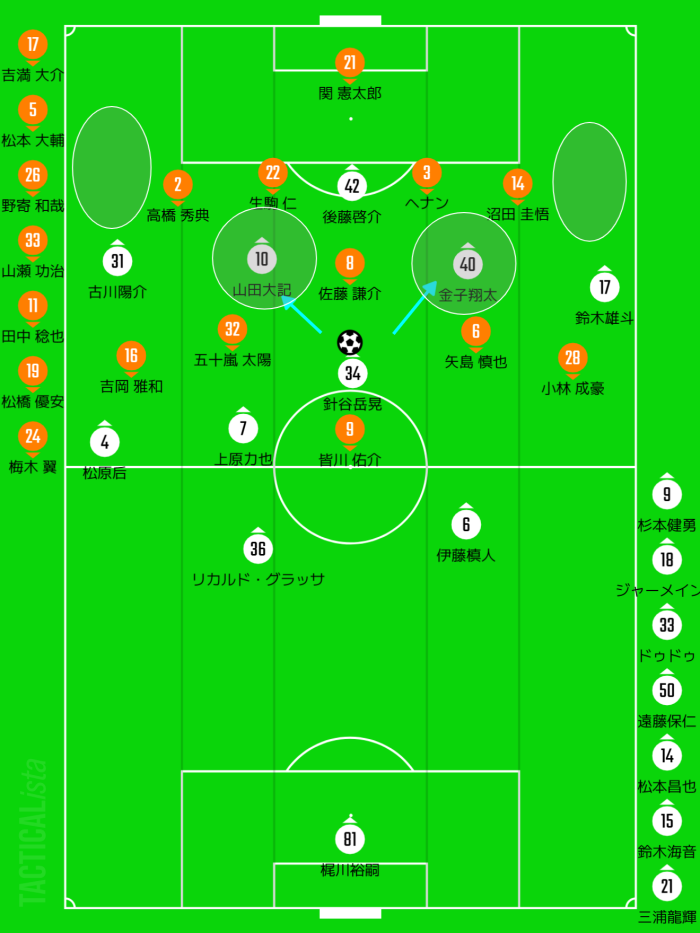 そこで相手DFの間に入るのがうまい上原・金子の起用を推奨したい。