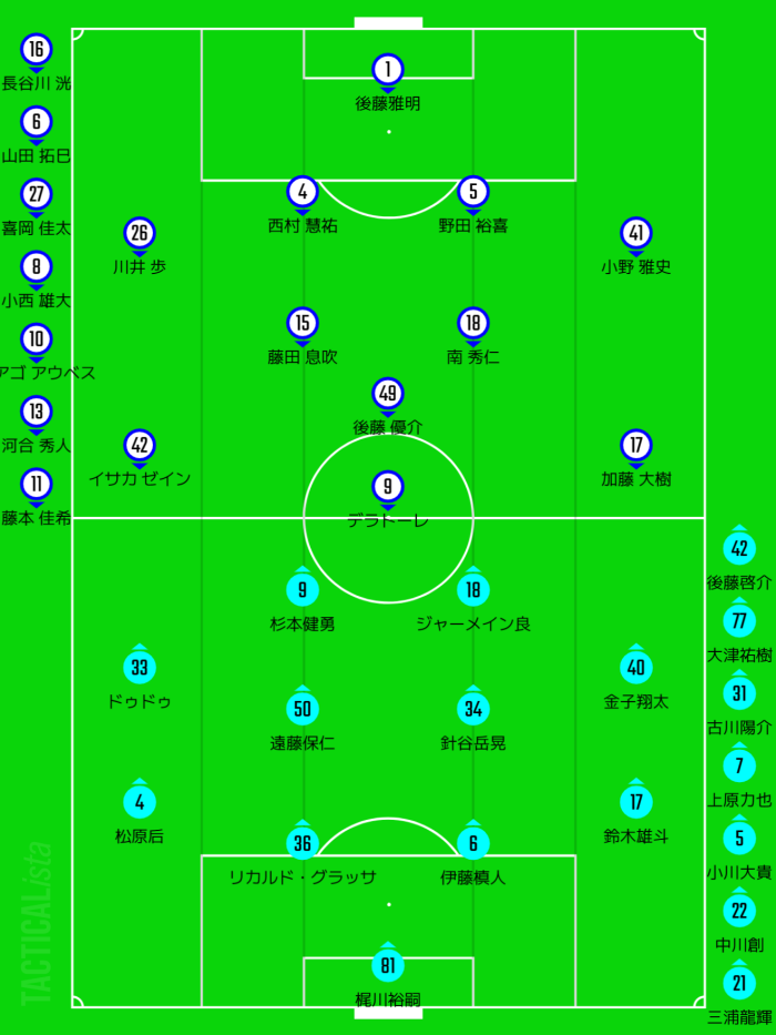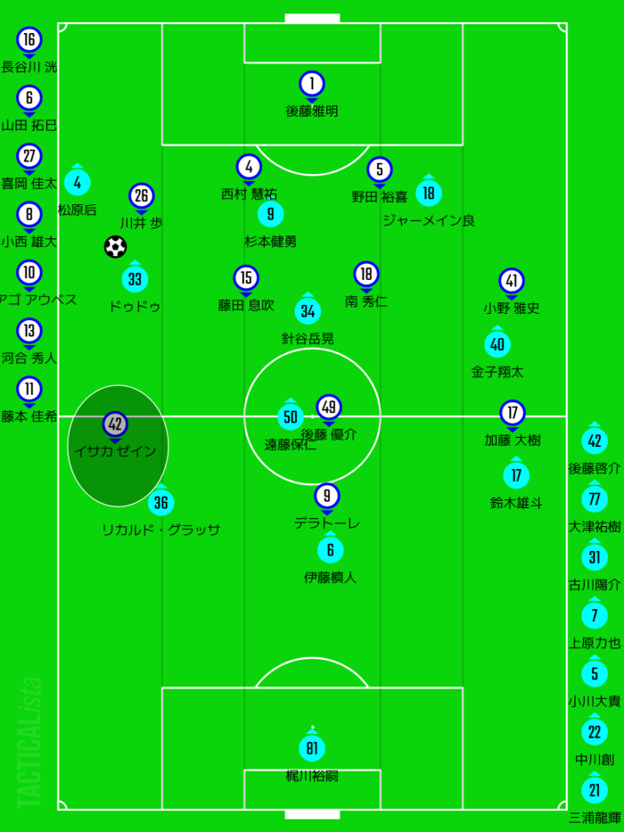 この図では左サイドの松原が上がる形を描きましたが、松原はイサカ ゼインをマークして、右サイド中心に攻める方が良いかもしれません。