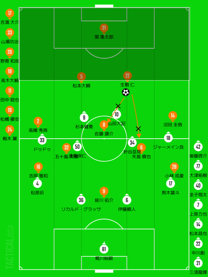 ミドルサードからのプレスで、アンカー佐藤へのパスは杉本・山田がパスコースを遮断。