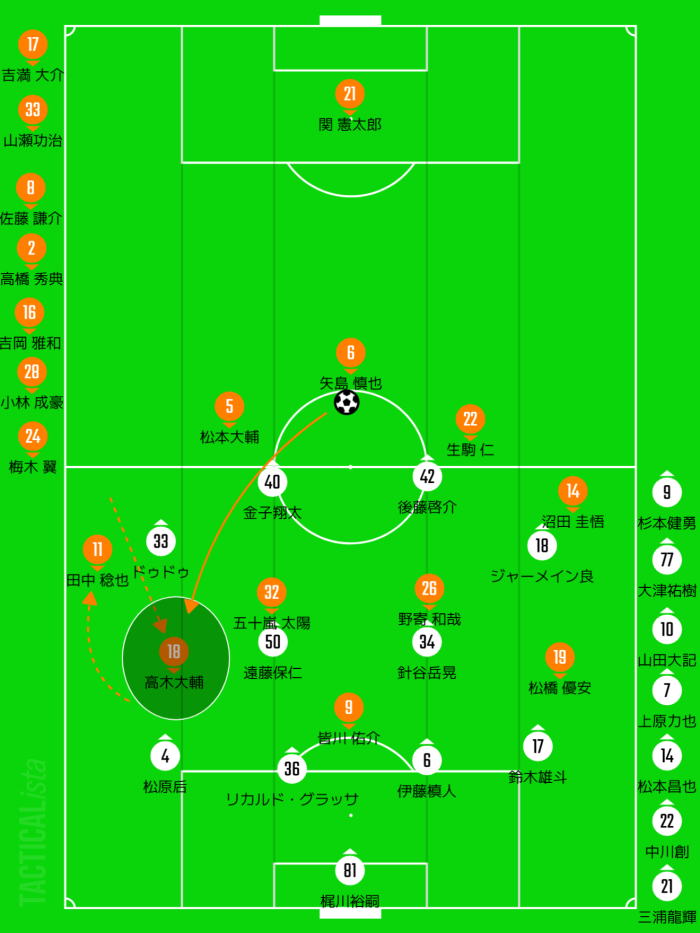 2.アンカー⑧佐藤の脇のスペースへドゥドゥ・山田がポジションを取る事で、山口の㉜五十嵐・⑥矢島はドゥドゥ・山田をケア。