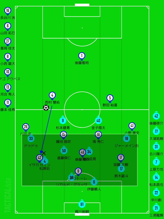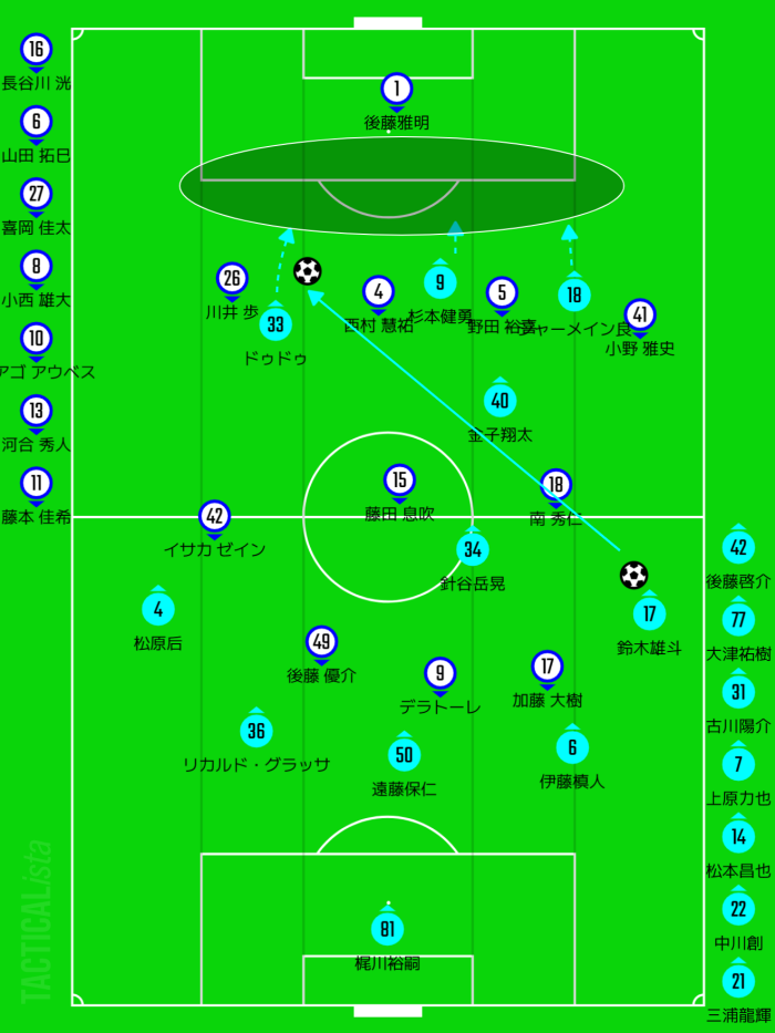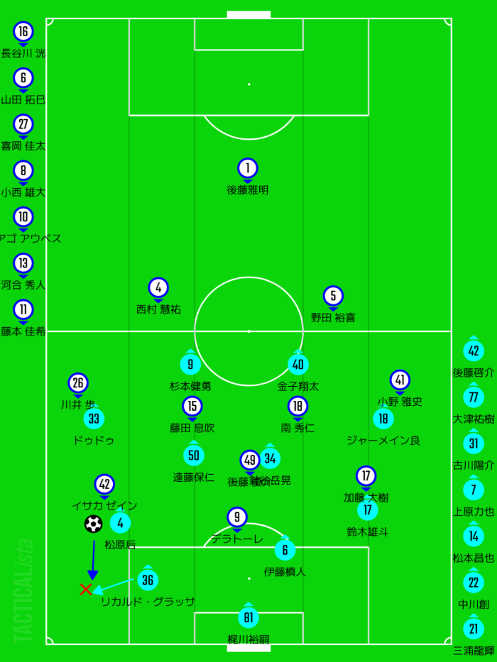 サイドのドゥドゥ・ボランチの遠藤・針谷が内側のスペースに入った場合にチェックに行く意識が共有されており、フリーにさせることはありませんでした。
