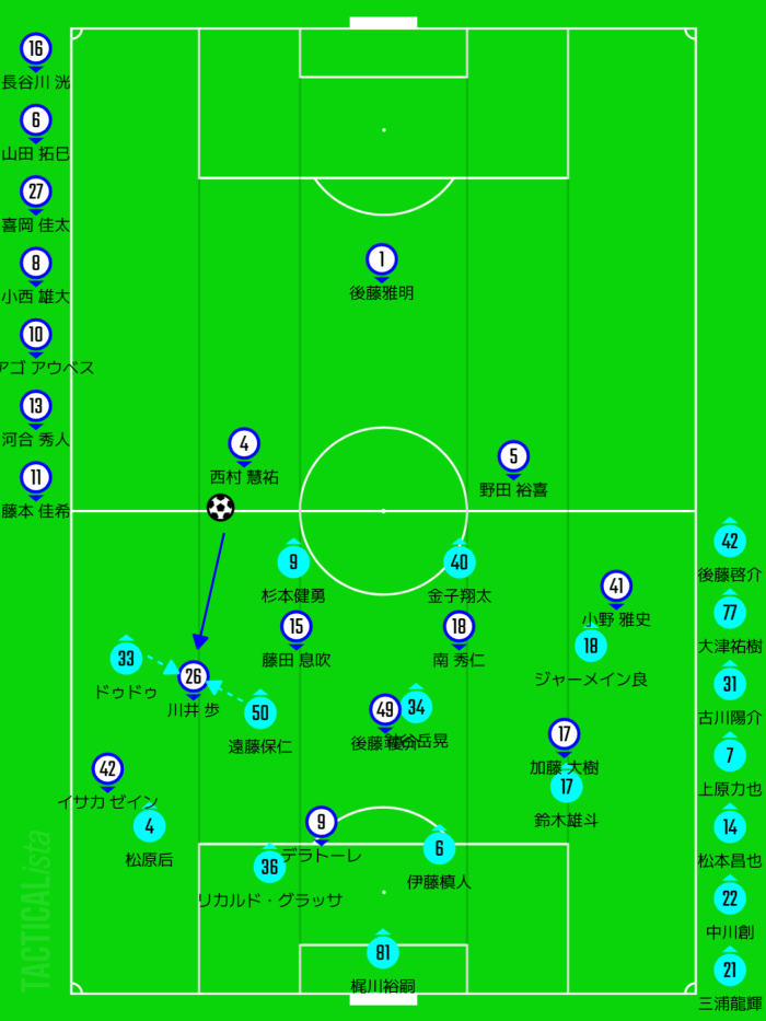 球際の強度が山口戦よりも高く、パスが入った瞬間に2人、3人で囲んで奪い切る意識も共有されており、特にドゥドゥ・健勇の守備が目立っていたのではないでしょうか。