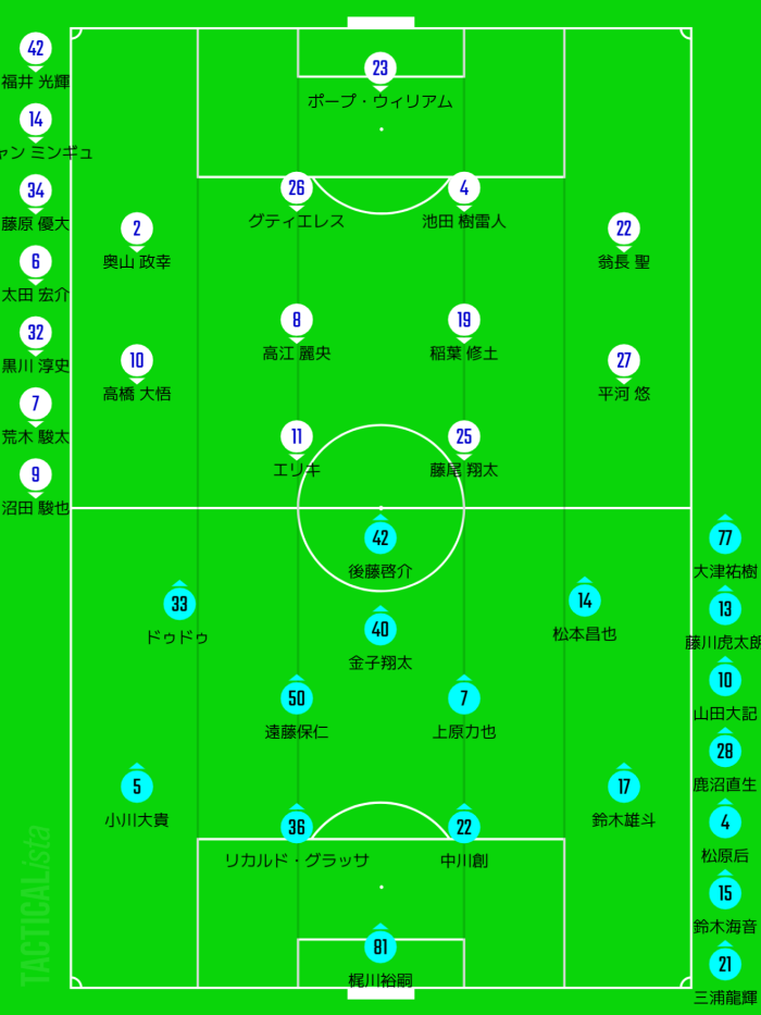 ルヴァンカップで良かった小川大貴を左サイドバックに入れ、後半から大貴を右、左に松原でローテーションすると予想。