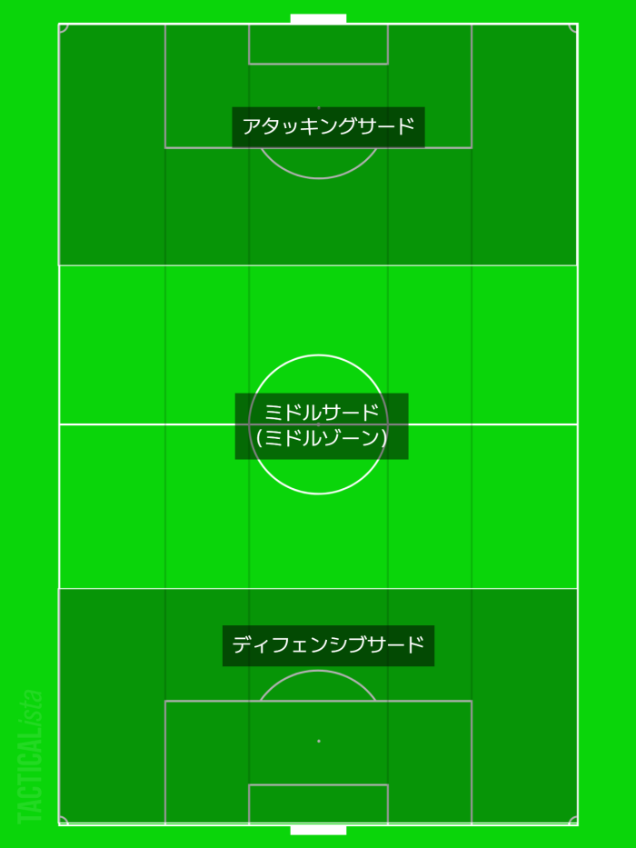 自陣ゴール前、GKがいるエリアをディフェンシブサードと呼びます。