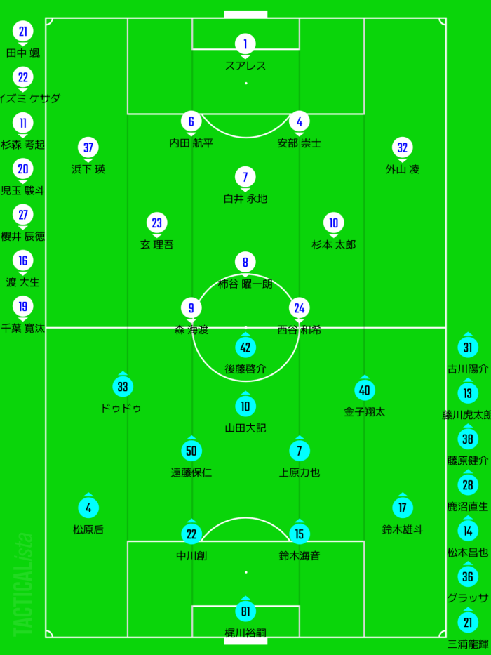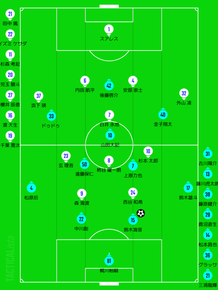 ベンチにはトップ下とボランチを兼任できる藤原健介を予想。