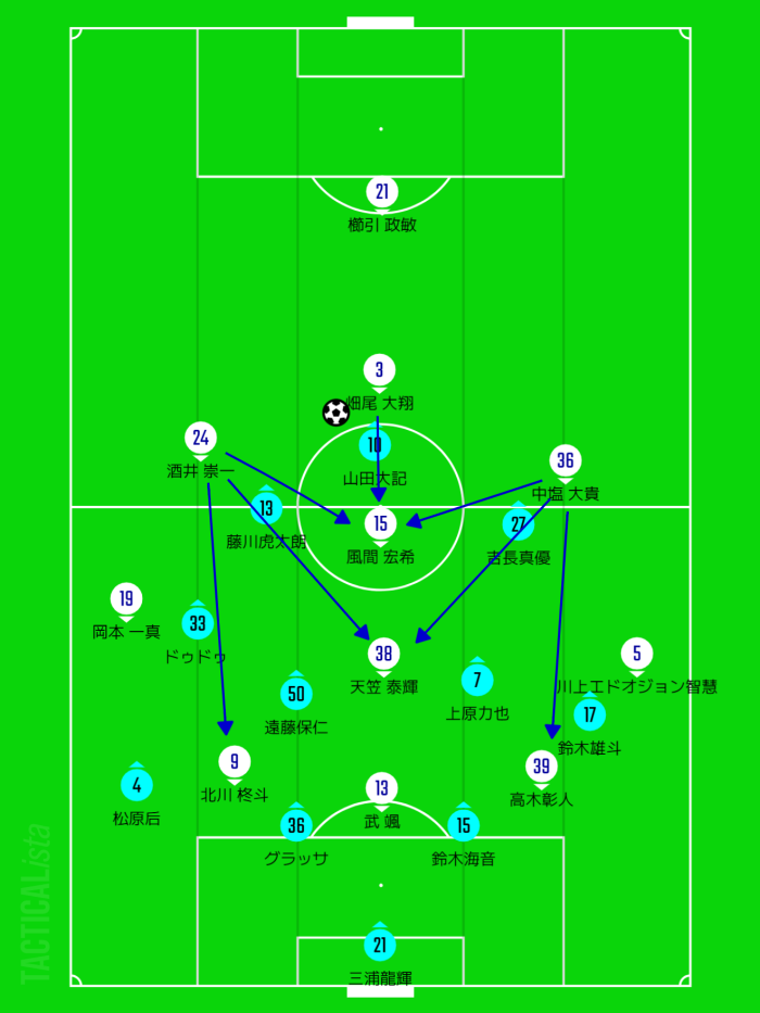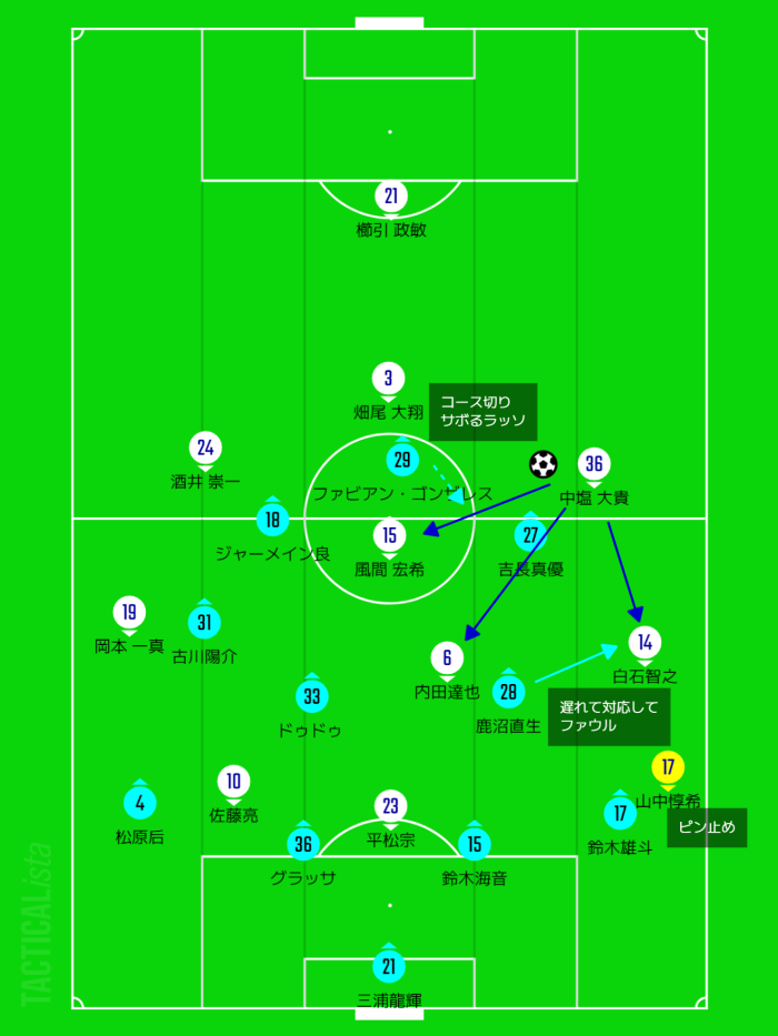 中央の風間へのパスコースは山田大記中心に藤川・吉長が封鎖。
