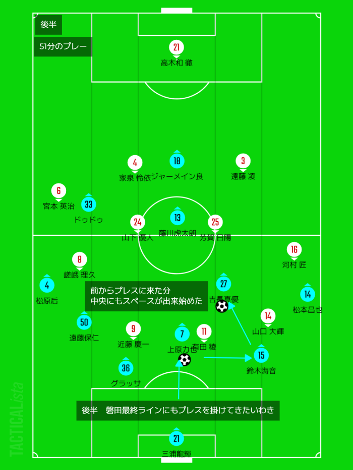 後半いわきはプレスラインを高くして、磐田最終ラインのグラッサ・海音・上原のところにもプレッシャーを掛けてきました。