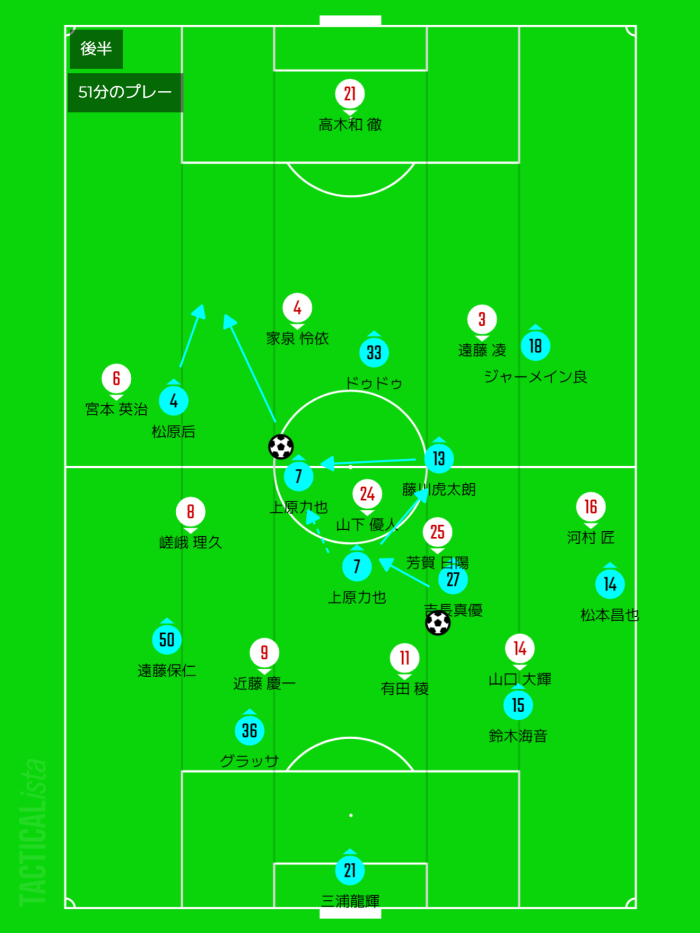 79分に疲労の見えた上原・吉長に代えて、ボランチに康裕、トップ下に藤原を入れたことで、ビルドアップが改善。