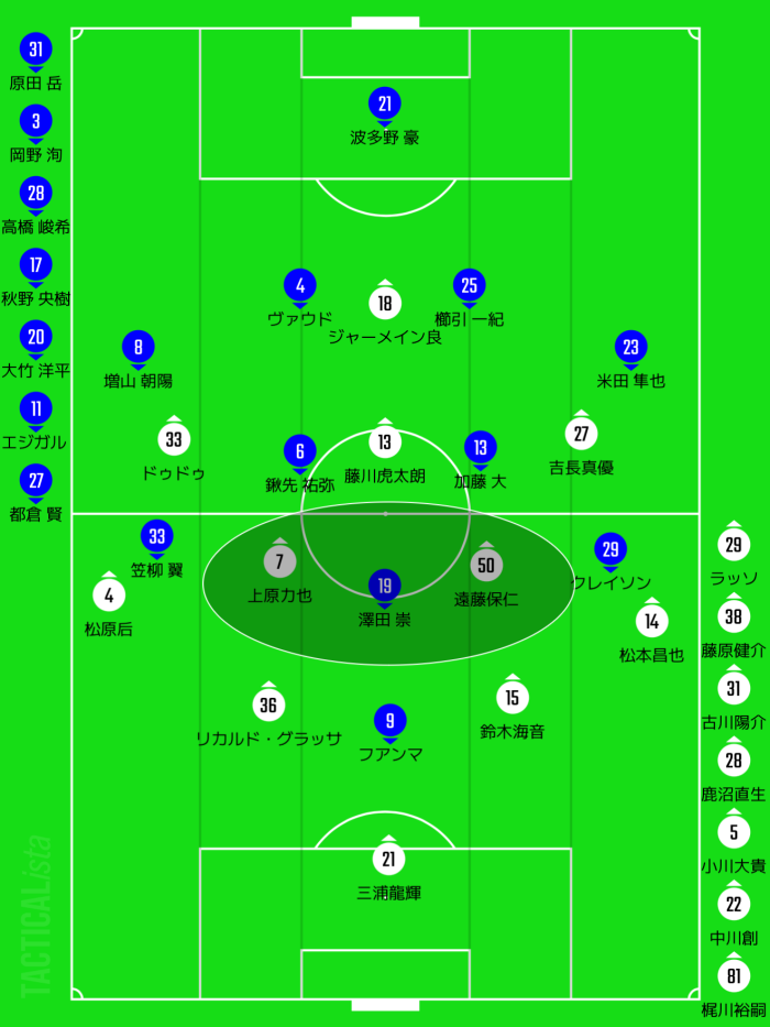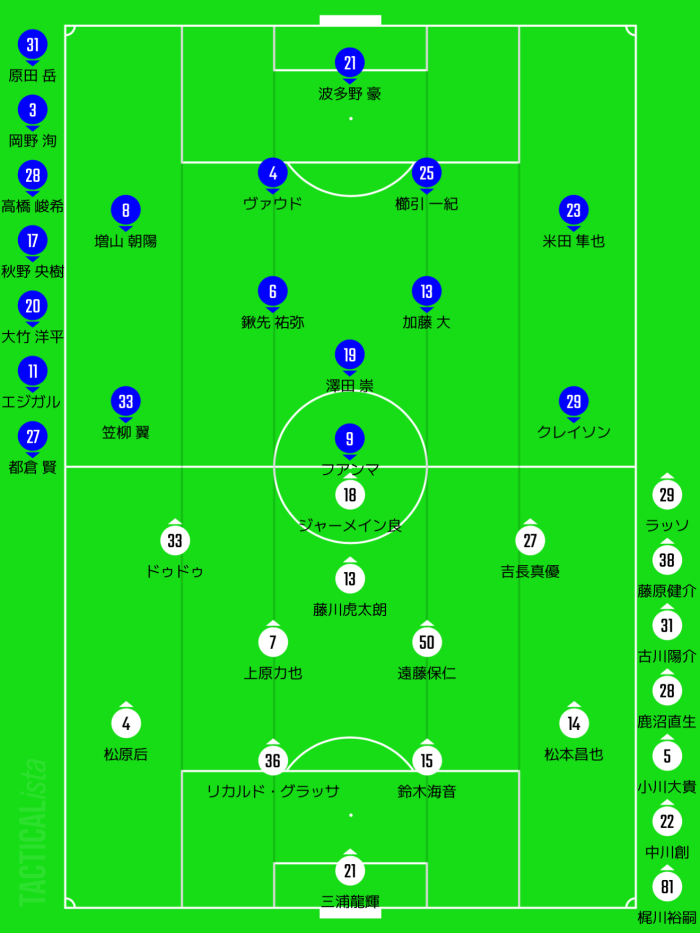 宮城に代わりトップ下に澤田、左サイドにクレイソン、カイオに代わりボランチに加藤を予想。
