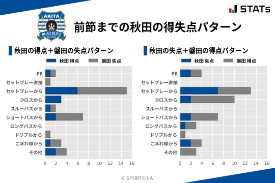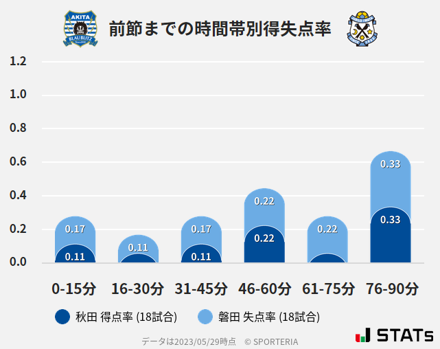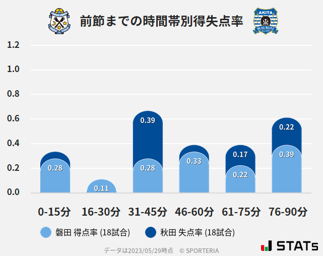 秋田の得点は76-90分に生まれやすい時間になっています。