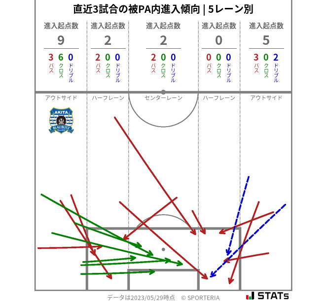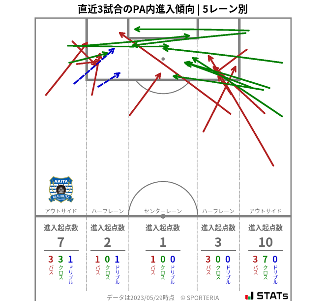 大分戦では秋田はファーサイドへクロスを送り、折り返しをシュートに行く形を多く使っていました。