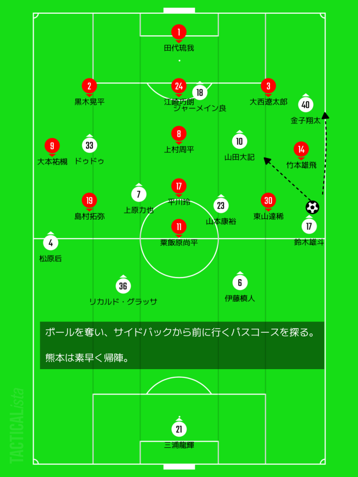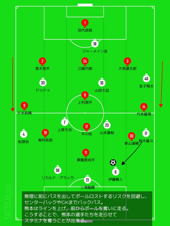 あえて無理して前に行かず、熊本の選手を帰陣させて走らせて、バックパスしてまた熊本を前に走らせる、かつ裏のスペースを空けさせる狙いがありそうなパス回し。