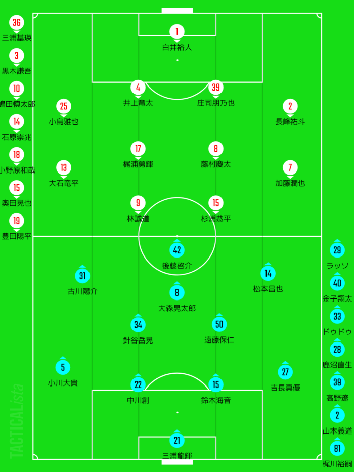 金沢は栃木戦のメンバーをベースに、右サイドハーフに大石、FWに林を予想。