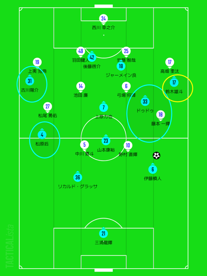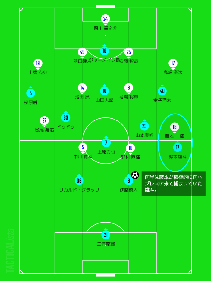 試合後インタビューにて前半、後半でポジショニングを変えていたという鈴木雄斗のポジショニングについて深掘りしていこうと思います。