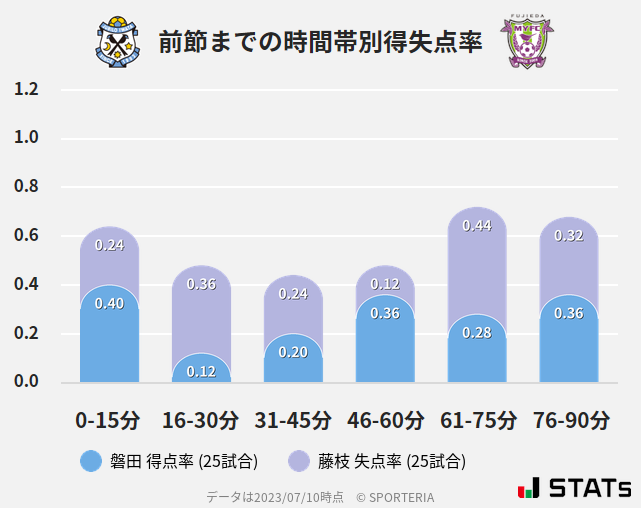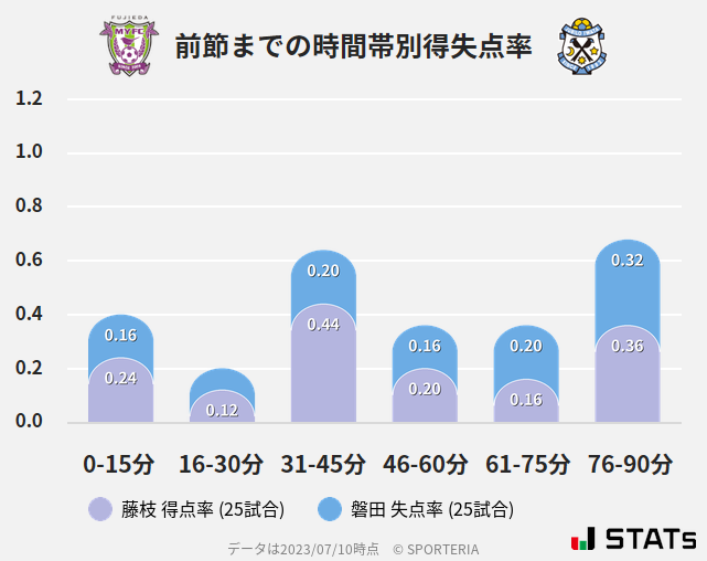 藤枝の失点率が高いため、どの時間帯も得点率が高くなっています。