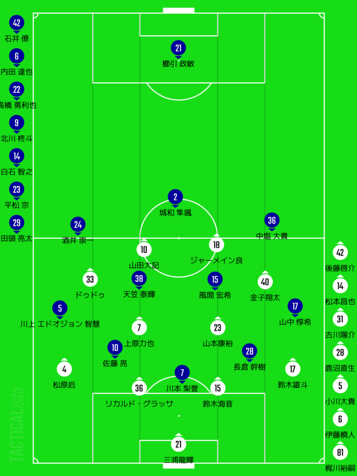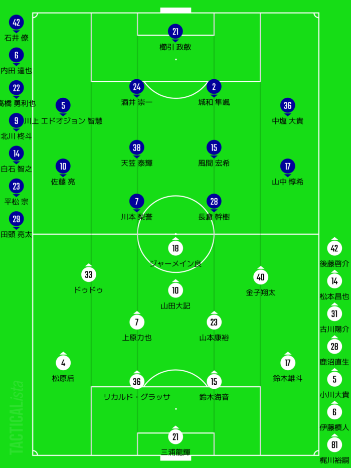 週末スタメン組がベースになると思いますが、CBは対人の強さ・スピード・ビルドアップの時のパススピードなど、伊藤槙人より鈴木海音のスタメンを個人的には推したい。