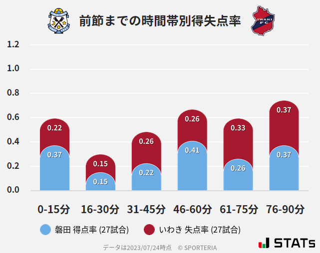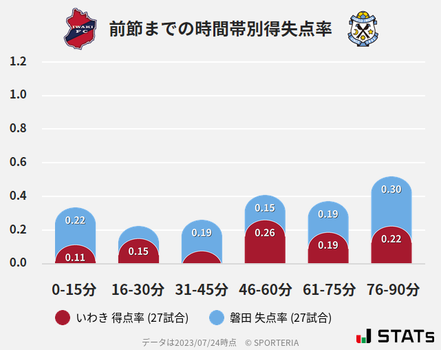 磐田の得点は前半16〜30分以外の時間帯で高い得点率となっています。
